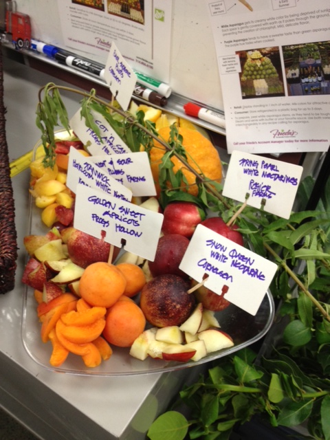 The office was filled with the aroma of peaches, plums, melons, berries, cherries and the crisp scent of lemon verbena. You can see that she labeled the fruits by variety and grower name, so our sales team could taste the difference. This is helpful when we are describing them to our customers across country.